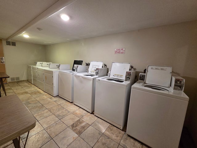 Coin-operated laundry in a dedicated complex laundry room on the main floor.