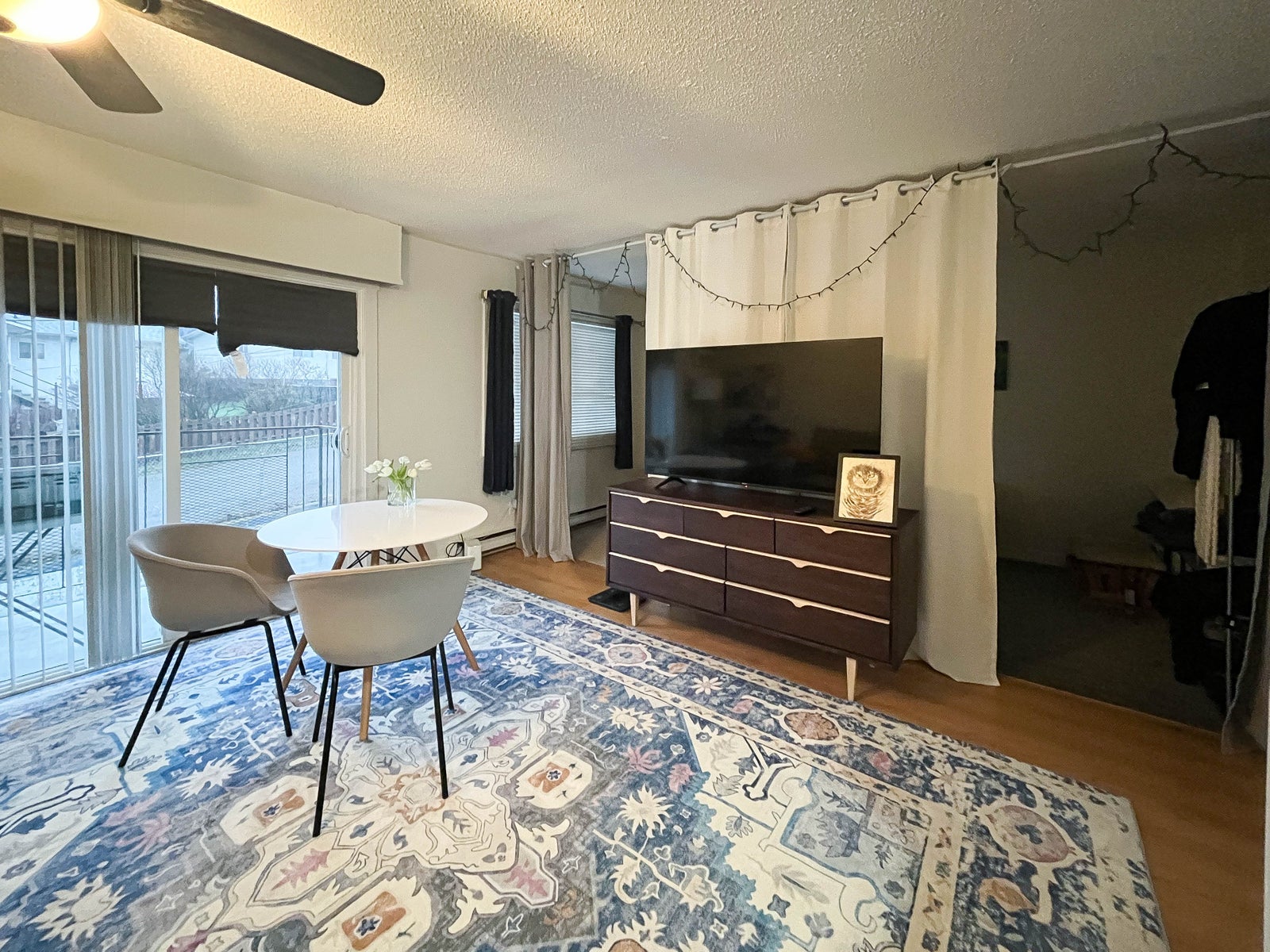 that can easily be separated into a private sleeping area and livingroom area.